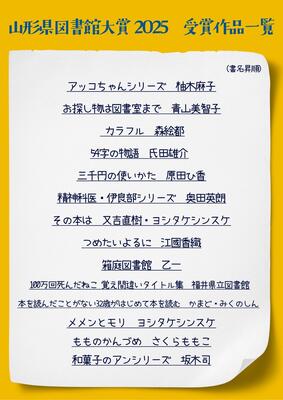 平成27 年度から山形県図書館協会「山形県公共図書館相互協力推進事業」として実施している公共図書館、大学図書館、高校図書館の連携企画です。一つのテーマに関連して、県立図書館含む県内公共図書館(室)36 館の職員がおすすめする作品を推薦、大学図書館、高校図書館を含めた県内図書館職員が投票を行い、多く票を集めた約20作品を「山形県図書館大賞」として発表します。
