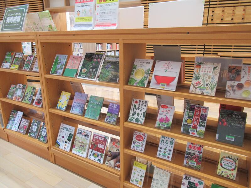 県立図書館では、食用植物の見分け方の本や、山菜の本、山野草レシピブック、ハーブティーの本など、