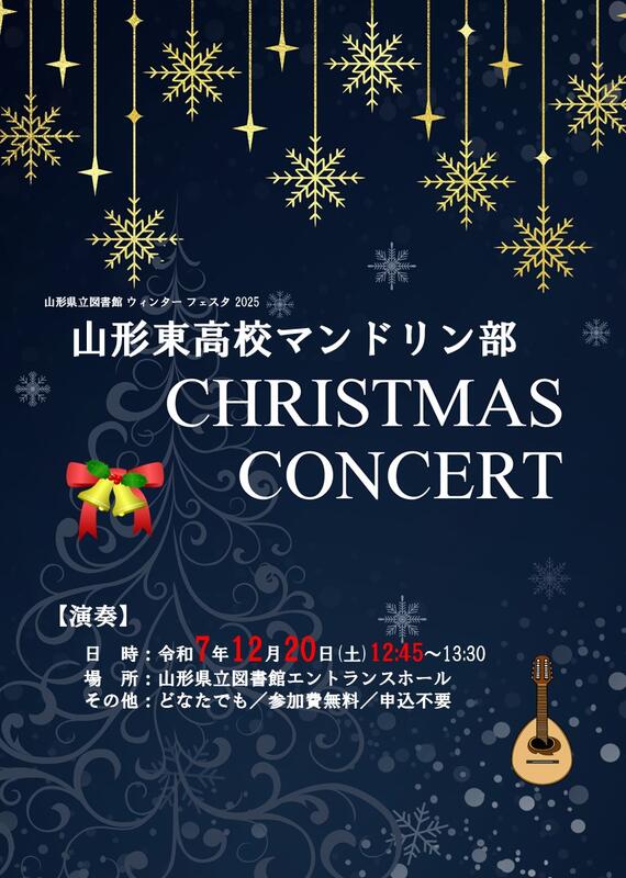 山形県立図書館では、12月20日(土)12時45分から山形東高校マンドリン部の皆さんによるクリスマス コンサートを開催します。