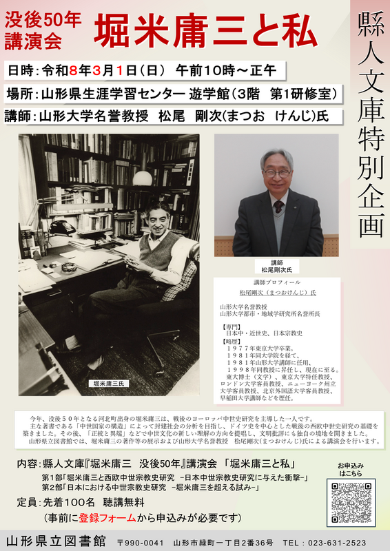 没後50周年の節目にあたり、山形県立図書館では、堀米庸三の著作等の展示を行うとともに、松尾剛次(まつおけんじ)山形大学名誉教授による講演会を開催します。