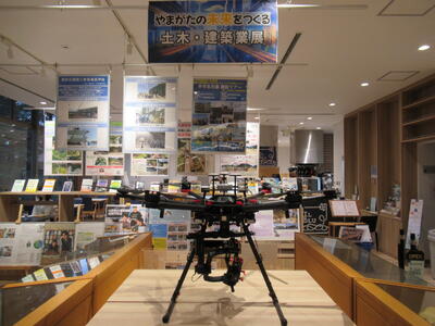 遊学館1階カフェレストランIL BLU遊学館前の県政情報発信コーナーでは、県県土整備部管理課による「やまがたの未来をつくる土木・建築業展」が始まりました。