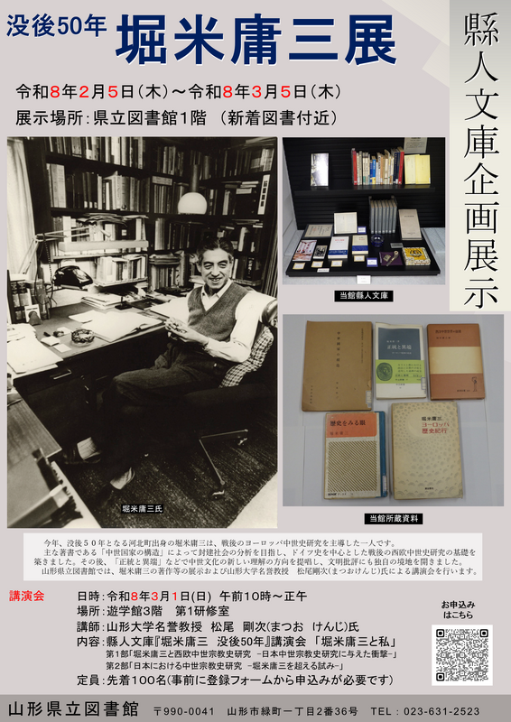 没後50周年の節目にあたり、山形県立図書館では、堀米庸三の著作等の展示を行うとともに、松尾剛次(まつおけんじ)山形大学名誉教授による講演会を開催します。