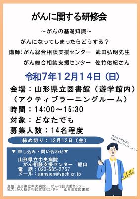 山形県立図書館では、県立中央病院がん相談支援センターと連携したイベント「がんに関する研修会」を12月14日(日)に開催します。場所は山形県立図書館(遊学館内)1階 アクティブラーニングルームです。参加ご希望の方は、事前のお申し込みが必要ですので、県立中央病院がん相談支援センターに電話(023-685-2757)かEメール(gansien@ypch.gr.jp)でお申し込みをお願いします。