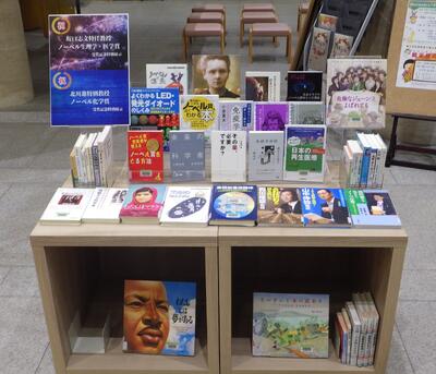 当館ではノーベル生理学・医学賞受賞者、大阪大学の坂口志文特任教授と共にお二人の受賞記念特別展示を行っています。ぜひ、県立図書館へ足をお運びください。