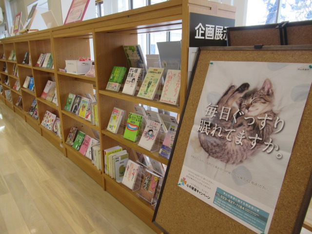 県立図書館では、村山保健所と連携し、心身の健康に関する本を中心に幅広いテーマの本を展示しています。
