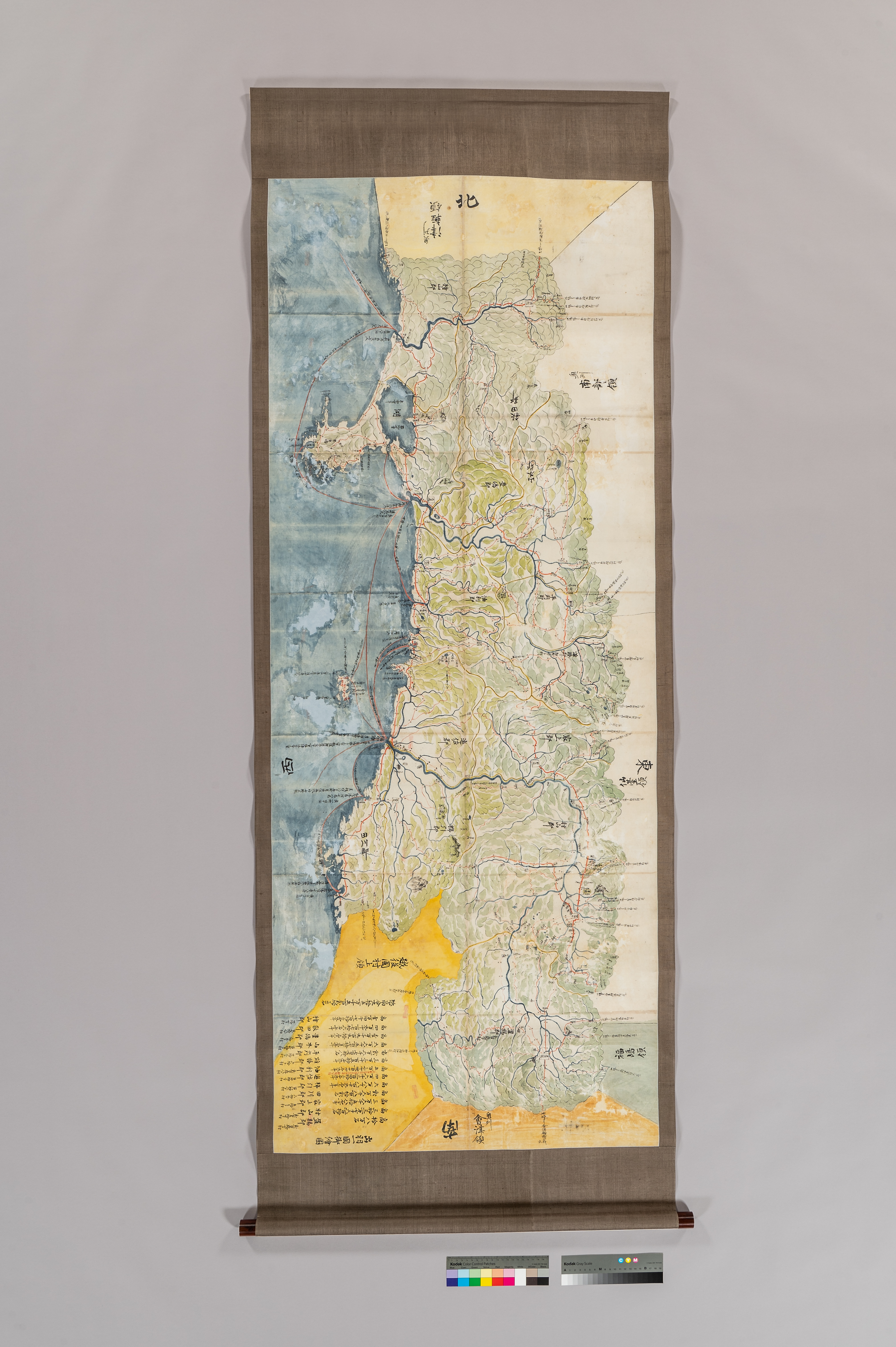 出羽国の13郡を詳細に描いたもので、山形は置賜・村山・最上・田川・櫛引・遊佐の6郡である。 街道や川筋、村々の位置等が記されており、街道を挟む形で描かれている黒丸は一里塚の表示で、国絵図作成にあたり幕府により示された統一基準である1里6寸の縮尺で描かれている。 村々は小判型の丸で記されているが、村名の記載は山形の上記6郡内となっており、そのほかは丸印のみで村名は記載されていない。 また、絵図中の脚注に、各郡の所領高が記されており、置賜郡「拾八万石」、村山郡「三拾三万七千六百拾石」、最上郡「三万六千五拾八石七斗」、田川郡「弐万六千八百拾弐石」、櫛引郡「六万八千八百廿九石壱斗」、遊佐郡「四万六千二百四拾三石九斗」等とあることなどから、原図は秋田県公文書館所蔵図と同様、正保国絵図と考えられている。 |