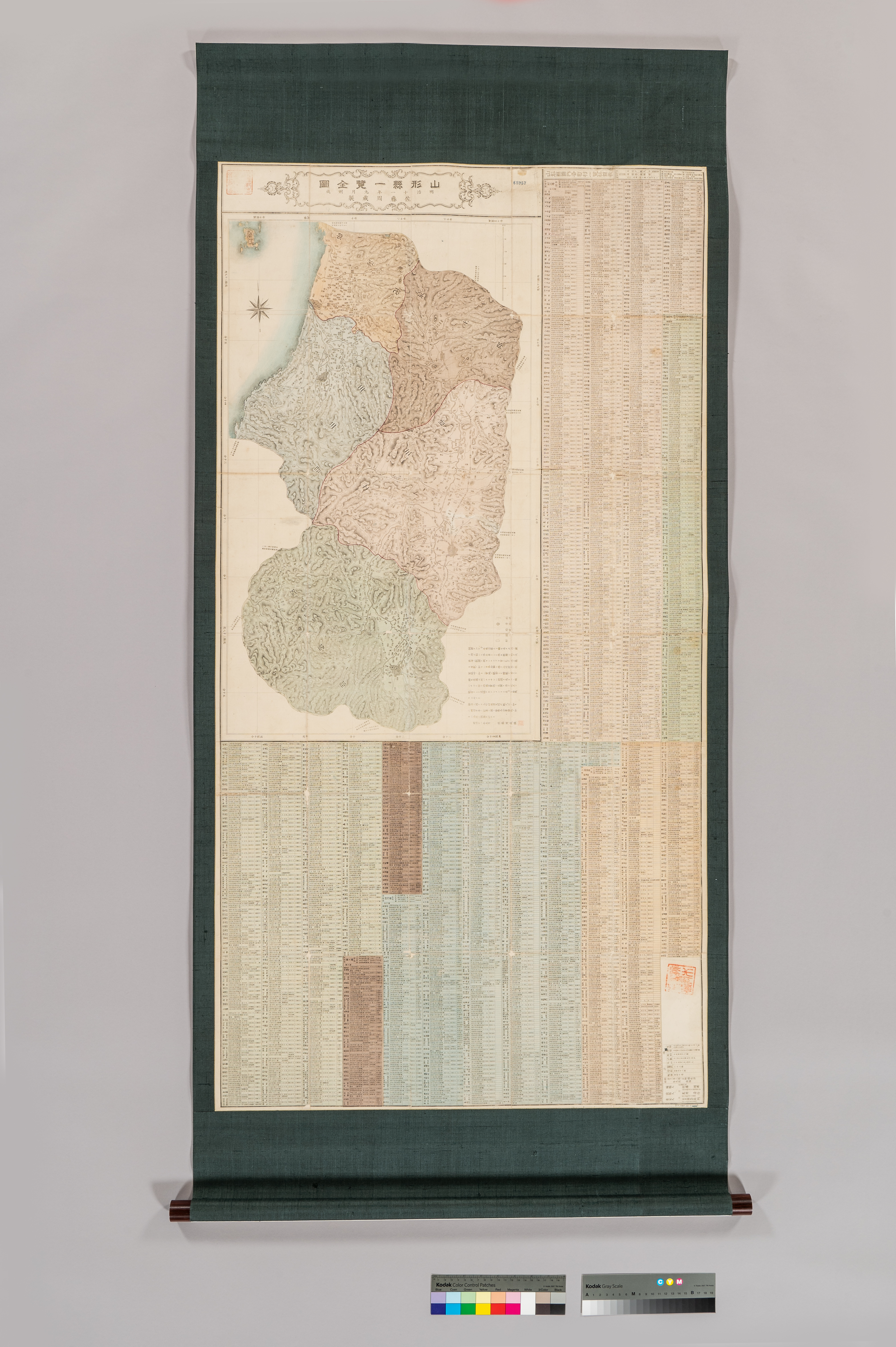 明治初期の本県全域の詳細な地図で、現在の「山形県」の形となった、統一山形県成立(明治9年8月)後に作成された絵図である。 絵図とともに「山形県管内各町村一覧科目表」として、町村ごとの「戸数」「人口」「地価」「学校」等を記した詳細な一覧表が掲載されており貴重である。 一覧表にある数値は脚注に、「余白ニ掲クル各町村地価反別戸数人口ノ如キハ明治十年ノ計算ニ拠リ警察各分署学校ノ如キハ本年ノ調査ヲ以テス」(旧字体は新字体で表記)等とあり、明治10年(1877)と明治11年の調査に拠るものであると、明治11年5月、佐藤周藏が記している。 |