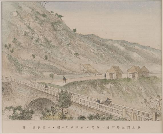 | タイトル | 最上郡三峠新道ノ内及位村及位川に架スル万代橋ノ図 |